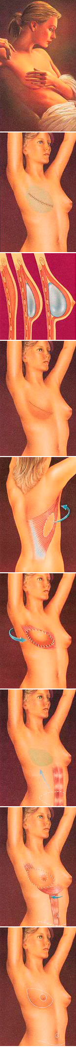 • Reconstrucción de aletas : un procedimiento alternativo para la reconstrucción implica la creación de un colgajo de piel con tejido tomado de otra parte del cuerpo como la espalda , el abdomen o las nalgas. En un tipo de cirugía de colgajo , el tejido permanece unido a la ubicación original , manteniendo el suministro de sangre . El colgajo que consiste en piel, grasa , músculo y con su suministro de sangre están conectados al pecho debajo de la piel , la creación de un bolsillo para el implante o en algunos casos , la creación de un volumen de la mama por sí mismo, sin la necesidad de un implante . Otra técnica de colgajo utiliza tejido que se extrae quirúrgicamente el abdomen, los muslos o las nalgas y luego se trasplanta en el pecho por volver a conectar los vasos sanguíneos en la región. Este procedimiento requiere un conocimiento adecuado del cirujano plástico que también tiene experiencia en cirugía microvascular. Sin tener en cuenta la manera en que el tejido está unido a un pedículo o trasplantado en el pecho como un colgajo microvascular , este tipo de cirugía es más complicada que una expansión de la piel . Las cicatrices se dejan en los dos tejidos , tanto en la zona donante , y en el seno reconstruido , y la recuperación llevará más tiempo que con un implante. Por otro lado , cuando la mama se reconstruye su totalidad con su propio tejido , los resultados son generalmente más natural y no hay preocupaciones acerca de un implante de silicona . En algunos casos , también puede tener el beneficio de un contorno abdominal mayor .